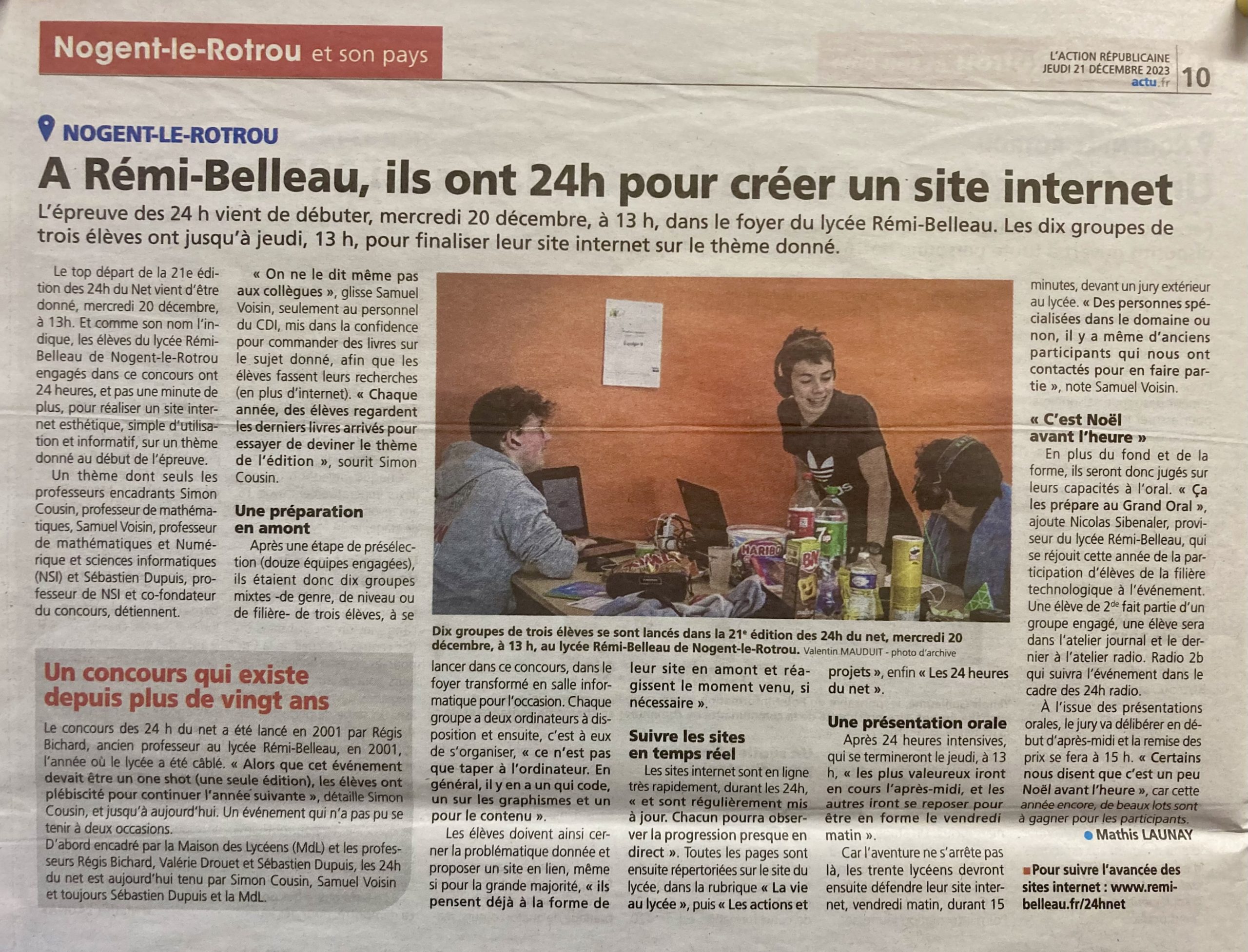 L’épreuve des 24 h du Net a débuté, mercredi 20 décembre 2023, à 13 h, dans le foyer du lycée Rémi-Belleau de Nogent-le-Rotrou. L’objectif : créer un site internet. Consulter l’article de presse du 21/12/2023 [L’Action L’Echo].