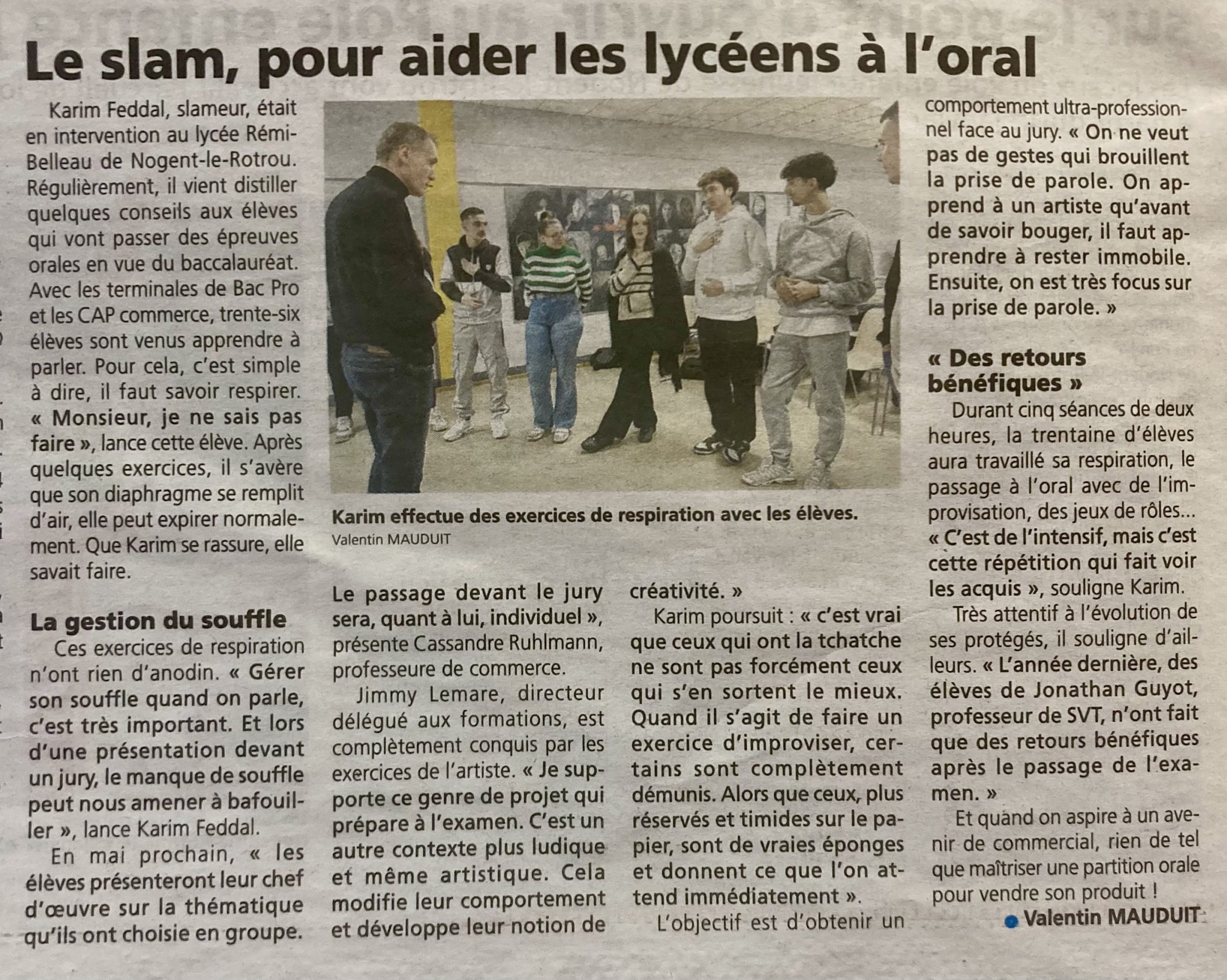 Pour performer à l’épreuve orale du baccalauréat, les lycéens de Rémi-Belleau ont reçu les précieux conseils de Karim Feddal, un slameur. Consulter l’article de presse du 29/12/2023 [l’Action l’Echo].